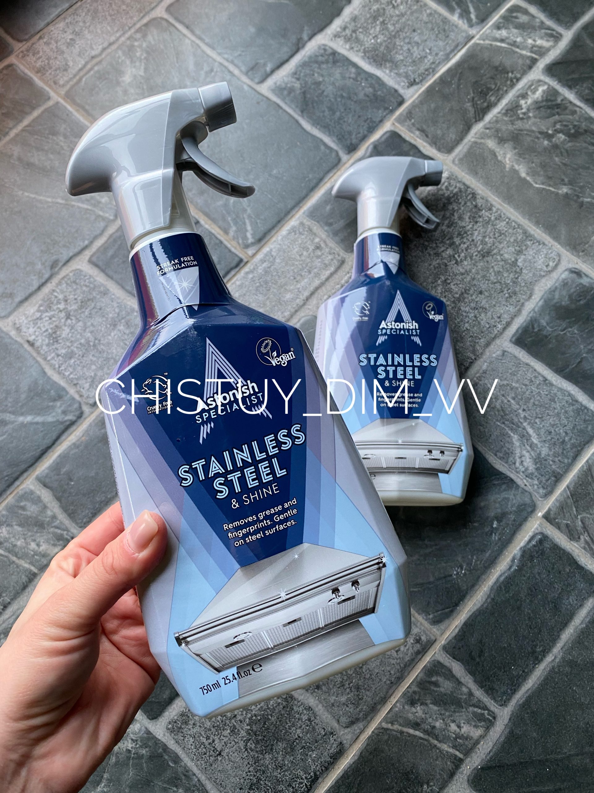 Миючий засіб для чищення Astonish Stainless Steel & Shine створений для чищення та полірування виробів із нержавіючої сталі. Очищувач делікатно та ефективно видаляє жир, бруд, відбитки пальців, сліди води на виробах із нержавіючої сталі. Поверхні стають блискучими, без розводів та смуг, набувають легкого акватичного аромату.Засіб «працює» швидко та легко. Його необхідно просто розпилити на поверхню, витерти сухою м’якою тканиною та отримати фантастичний результат. Підходить для будь-яких полірованих поверхонь з нержавіючої сталі: від холодильників та витяжок до велосипедних бризковиків та чайників. Особливості використання: не наносьте на гарячі поверхні, не допускайте висихання продукту без протирання та уникайте контакту з натуральним каменем або чутливими до кислоти поверхнями.