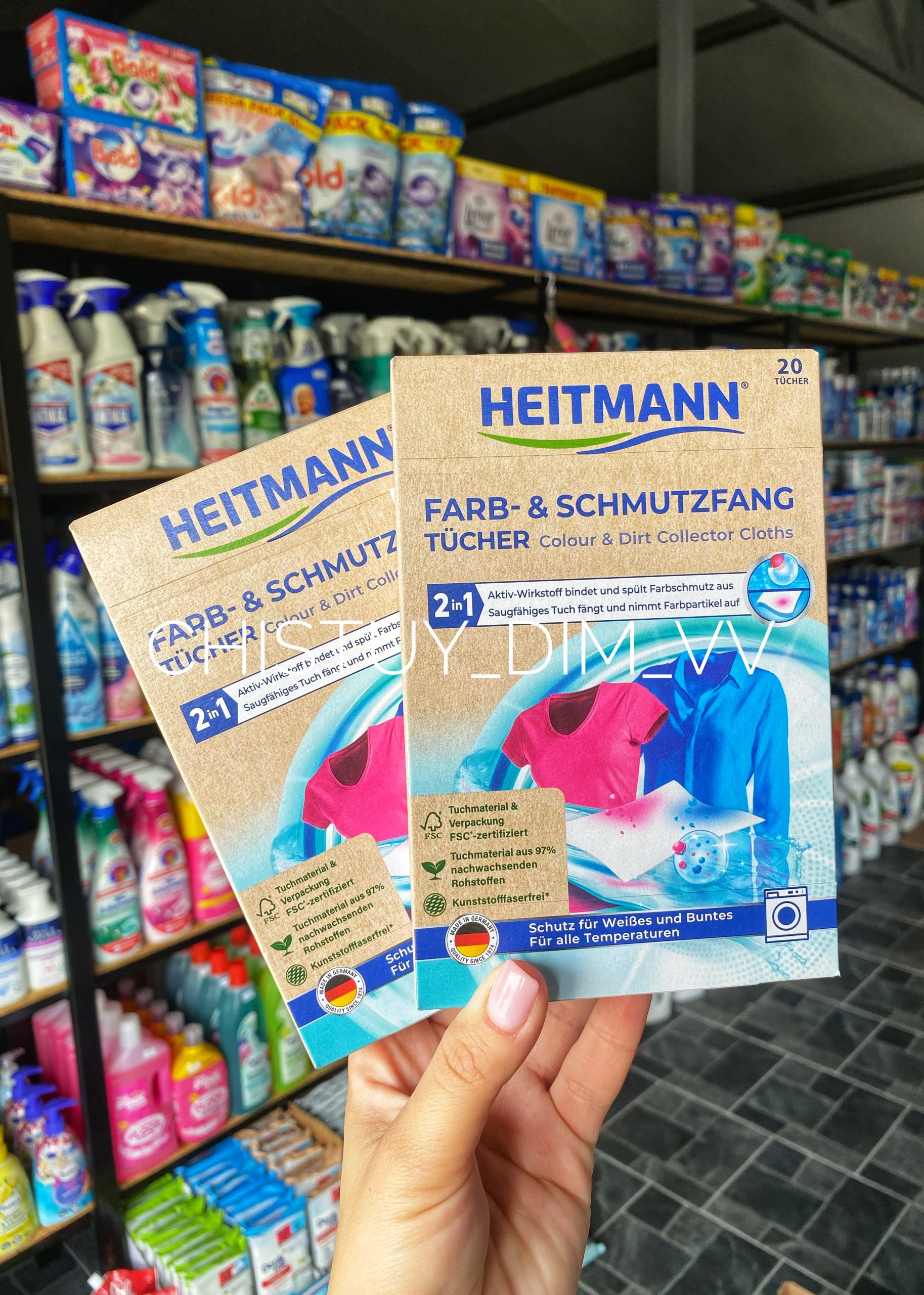 Забезпечте своєму одягу подвійний захист: колір і частинки бруду видаляються під час прання. На тканинах вони можуть проявлятися як знебарвлення й посивіння. Фарба HEITMANN без пластикових волокон і брудоуловлювальні серветки ефективно запобігають такому ефекту.